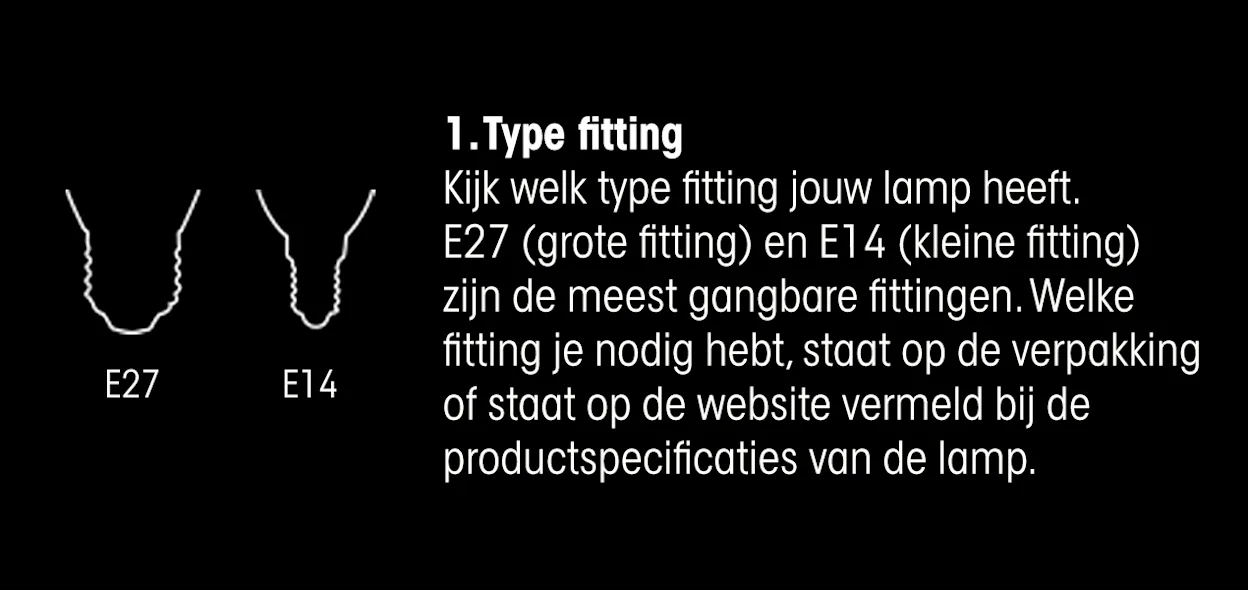 Er zijn verschillende soorten fittingen, waarbij een E27 (grote fitting) en E14 (kleine fitting) de meest gangbare zijn. Welke fitting je nodig hebt, staat op de verpakking, in de lamp zelf of op de website vermeld bij de productspecificaties van de lamp.