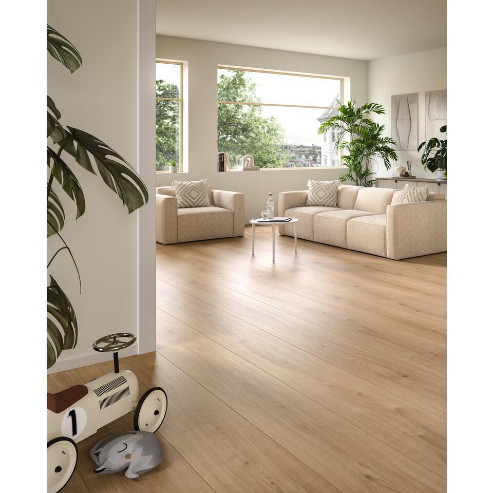 Laminaat Sanner is een naturel eiken vloer die veel rust en een natuurlijke uitstraling aan je ruimte geeft. Hij is perfect te combineren met diverse interieurstijlen. Sanner heeft geen v-groef waardoor de planken perfect aan elkaar aansluiten en je geen scheiding ziet tussen de planken. Het zijn extra brede planken waardoor je de ruimte sneller vult en groter laat ogen. Perfect voor zowel grote als kleine ruimtes.