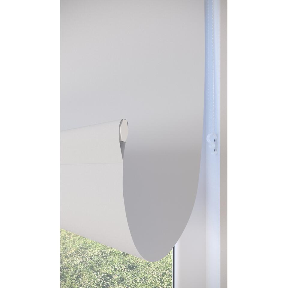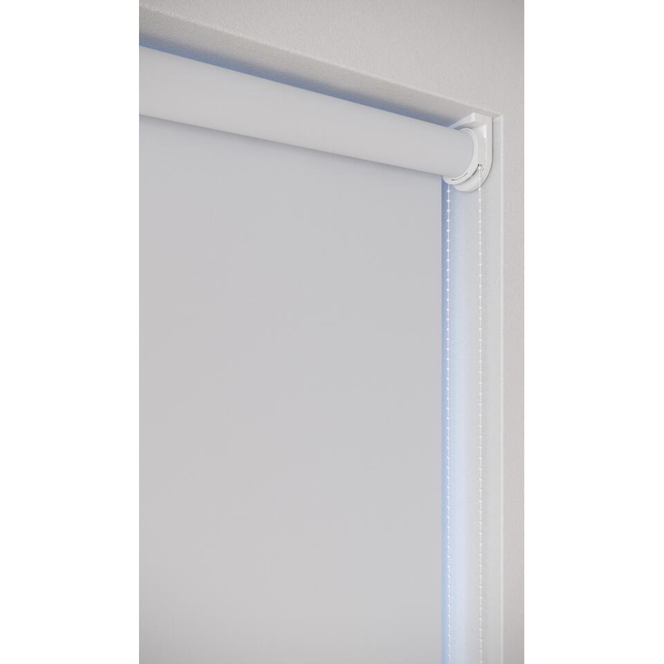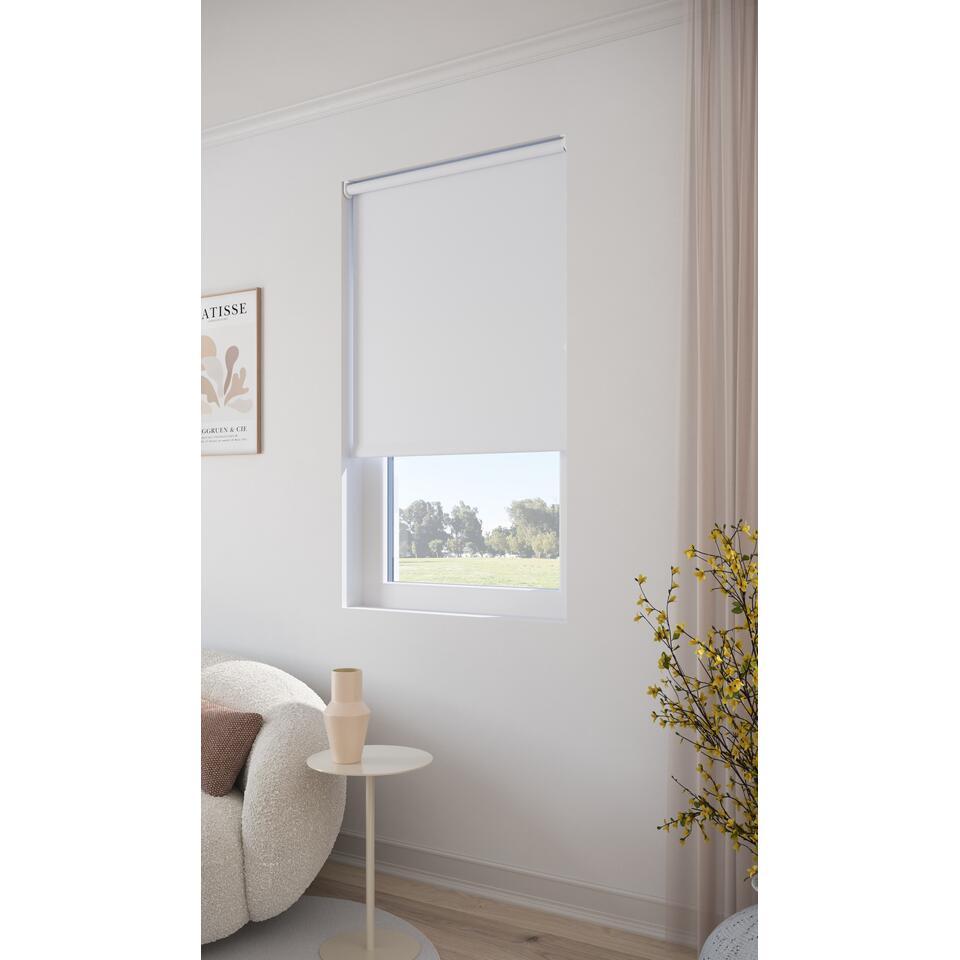Verduisterend rolgordijn effen wit met meekleurende achterzijde. Dit rolgordijn is op maat te maken en is samengesteld met witte eindkappen, witte kunststof ketting, aluminium ovale onderlat en universele wand- en plafondsteun. Eenvoudig af te nemen met een vochtige doek.